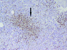 Interstitial abnormal lymphoid infiltrate in bone marrow biopsy (40X Hematoxylin and Eosin stain).