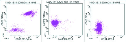 Abnormal cells positive for CD19 and CD20 with kappa restriction and negative for CD10 and CD34.