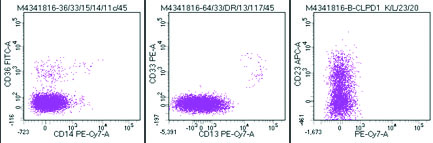 Abnormal cells negative for CD36,CD14,CD13 and CD 33 and variably positive for CD23.
