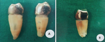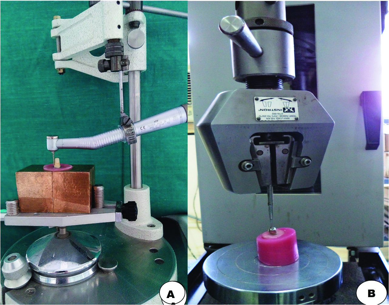 The present in vitro study was conducted in Department of Prosthodontics, Saraswati Dental College and Hospital, Lucknow, Uttar Pradesh, India in collaboration with Central Institute of Plastic Engineering and Technology, Lucknow. Forty extracted, human permanent mandibular premolars of approximately same dimensions were selected for the study which was measured using an electronic digital Vernier’s calliper (Mitutoyo/Digimatic, Japan) to make sure that they satisfy the following inclusion criterias: Mesio-Distal (M-D) dimensions: 5 mm±1, Bucco-Lingual (B-L) dimensions: 7 mm±1, root length atleast 15 mm [Table/Fig-1a,b]. Additionally, periapical B-L and M-D radiographic views were taken to ensure the presence of straight, single canal orifice, and completely formed apices. The teeth were inspected to exclude any defects or cracks, restorations or caries and previous endodontic restorations. Disinfection of the specimens was done using 0.5% chloramine T aqueous solution at 4°C for one week. Subsequently the selected teeth were stored in normal saline throughout the procedure to prevent desiccation.