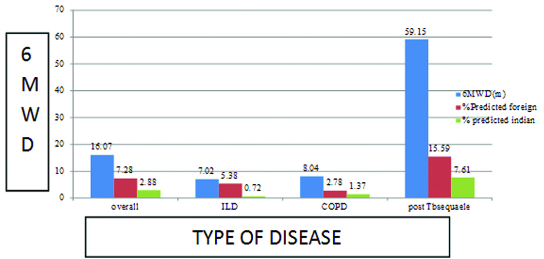 Chronic Pulmonary Diseases (CPDs) constituted mainly by Chronic Obstructive Pulmonary Disease (COPD), Interstitial Lung Diseases (ILD) and post infective airway disease which are the major cause of morbidity and mortality worldwide. Global prevalence of COPD stands at 10.1% [1], and that of ILD varies from 13-20/100,000 [2]. With increasing lifespan and treatable communicable diseases, the global burden of chronic diseases is expected to rise, particularly in the developing countries which share 80% of the burden. Significant extrapulmonary effects contribute to the morbidity and affect the quality of life in individual patients. Spirometric analysis is used to predict outcome in CPDs; however, There is an increasing evidence suggesting that there is discrepancy between extrapulmonary effects and airflow limitation [3]. Physical activity has proven to be an important predictor of mortality in several chronic diseases [4-6]. Six minute walk test (6MWT) assesses the functional capacity of patients with cardiopulmonary diseases and provides global analysis of the respiratory, cardiac, and metabolic systems. According to the American Thoracic Society (ATS), the most precise indication for the performance of the 6MWT is mild or moderate lung or heart disease [7]; it is used in order to measure treatment response, as well as to predict morbidity and mortality.