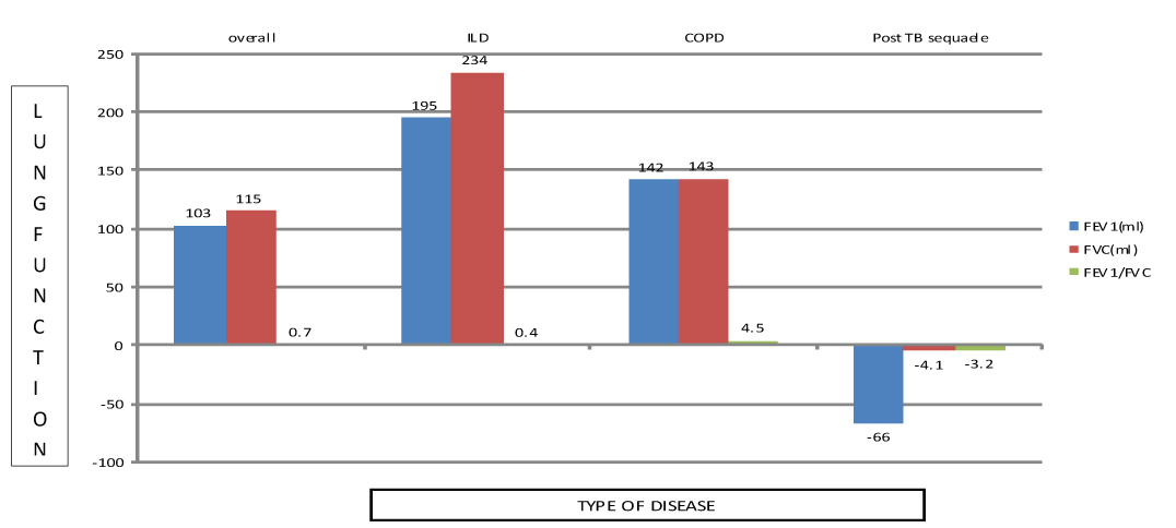 Change in spirometry over a period of time is also heterogeneous. It is influenced by BMI, baseline spirometric values, variability in technique, environmental exposures and insufficient number of measurements, independent of the course of the underlying lung pathology. Thus inability to show a significant physiologic decline of spirometric values in a given subject does not necessarily mean non progression of disease [27]. Casanova C et al., concluded that the progression of COPD is very heterogeneous [27]. Most patients in their study showed no statistically significant decline of FEV1. Anthonisen NR et al., observed decline of FEV1 by 39 ml/yr in COPD patients who were on treatment [28]. Collard HR et al., observed improvement of FVC in one year in ILD in 13 patients out of 51 and 23 patients had less than 10% decline in FVC, and rest had more than 10% decline [29]. Sputum positive pulmonary tuberculosis, longer duration of treatment, high radiological score before treatment and less radiological improvement after treatment are associated with more decline in lung functions in post TB sequelae [30]. Another study showed that the annual decrease in FEV1 was 35.3 ml in patients with obstructive defects within 15 years after the end of anti-tuberculosis treatment [31]. We observed improvement in spirometric values in ILD (FVC-234 ml, FEV1-195 ml) and COPD (FEV1-142 ml, FVC-143 ml) and in post Tb sequelae there was decline in spirometric values (FEV1: -66 ml, FVC: -4.1 ml) as depicted in [Table/Fig-3].
