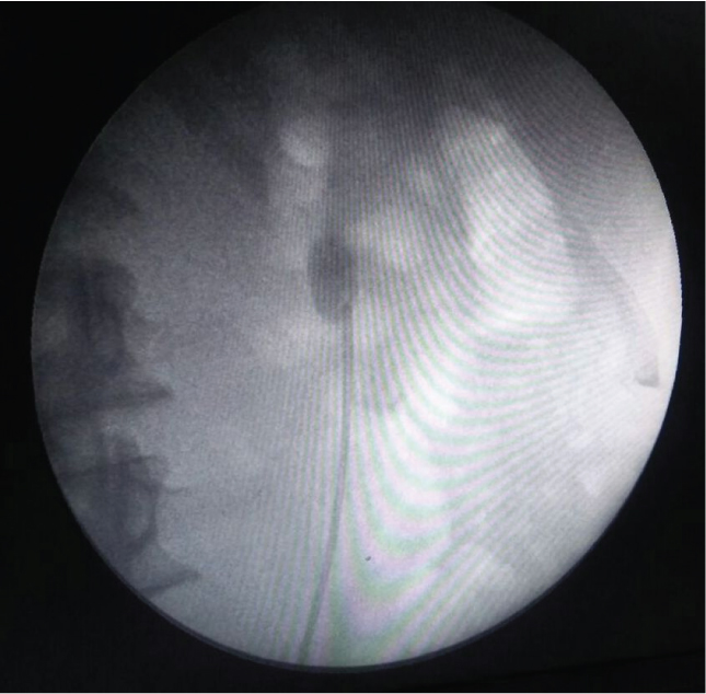 In Group-I (antegrade air pyelogram), the collecting system was delineated by targeting the renal stone using a 22 gauge spinal needle under fluoroscopic guidance while the patients were in the prone position [Table/Fig-1a-c]. A 22 gauge spinal needle was positioned at 0/30-degree by rotating C-arm enabling the urologist to aspirate urine from the collecting system hence confirming the proper positioning. Then the air pyelogram was performed using air. Following this the targeted calyx was punctured with 18 gauge diamond tip initial puncture needle and 0.038 inch J-tip PTFE guide wire put. Whereas, in Group-II (retrograde air pyelogram) urethral catheter was inserted in lithotomy position and then patient was turned from the lithotomy to prone position. Room air was injected through ureteric catheter for PCS identification [Table/Fig-2]. Targeted calyx was identified and access was attempted under fluoroscopic guidance with 18 gauge diamond tip initial puncture needle and J-tip guide wire put. Subsequent tract dilatation and stone extraction were same in both groups. Assessment of following parameters was made: