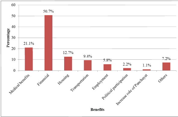 When asked about additional benefits study subjects expect from government, 76 (21.1%) subjects responded that more medical benefits, 183 (50.7%) demanded for more financial support, 46 (12.7%) said housing facilities, 34 (9.4%) expected for more transportation facilities, 21 (5.8%) asked for employment opportunities, 8 (2.2%) demanded for more political participation for them and 4 (1.1%) desired an increase in their role in local governance (panchayat) as shown in [Table/Fig-4].