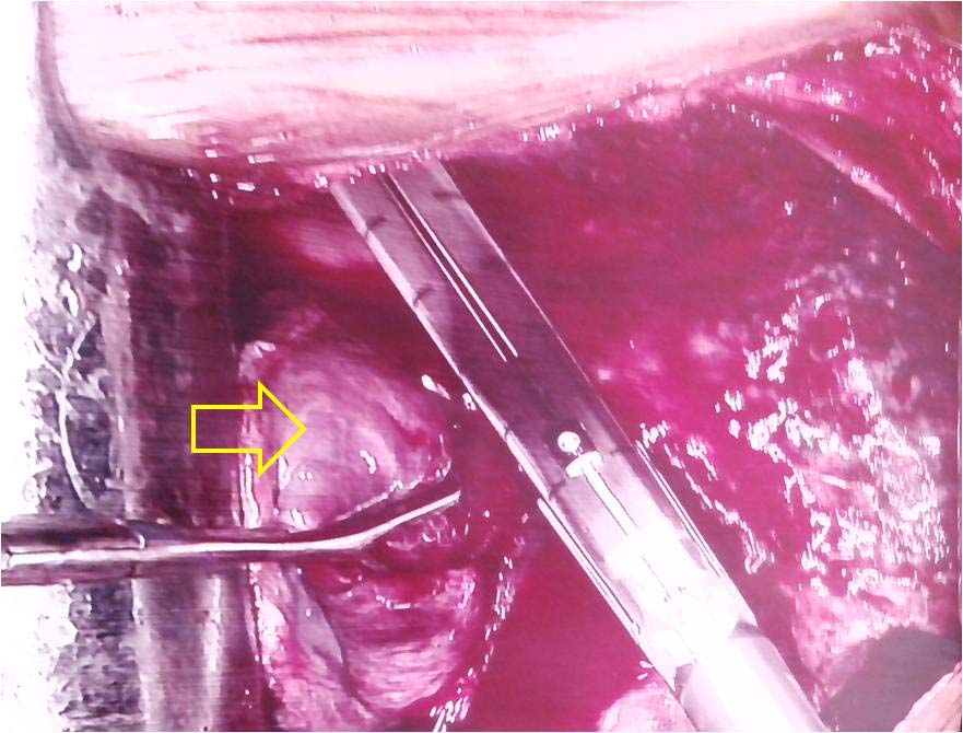Intraoperative photograph showing large, fleshy, cystic, vascular mass involving left lower lobe.