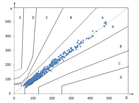 The performance of the EXIMO™ BGMS was assessed as per ISO 15197:2013 section 8 criteria (≥95% of results fall within ±15 mg/dl of the reference results for sample blood glucose <100 mg/dl and ±15% of the reference results for sample blood glucose ≥100 mg/dl). Bland-Altman plot was generated to display the difference between the BGMS results and the reference results [13]. The CEG analysis was performed to assess the clinical importance of the BGMS errors [14]. The analyses were performed using a Microsoft ExcelTM VBA macro program (Microsoft Corporation, Redmond, WA, USA). We also performed SEG analyses, a novel error grid system introduced recently by several medical societies and authorities [15].