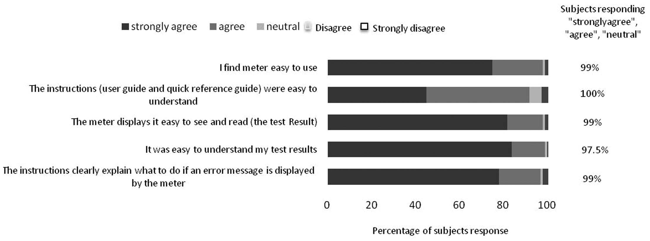 Subject questionnaires: More than 95% of patients were strongly agree/agree with the questionnaire with respect to use of instrument, meter display, result understanding and kind of procedure after error displayed by the meter. However, approximately 90% of population agreed with understanding of reference guide or instructions. [Table/Fig-7] depicts results of the ease-of-use subject questionnaires.