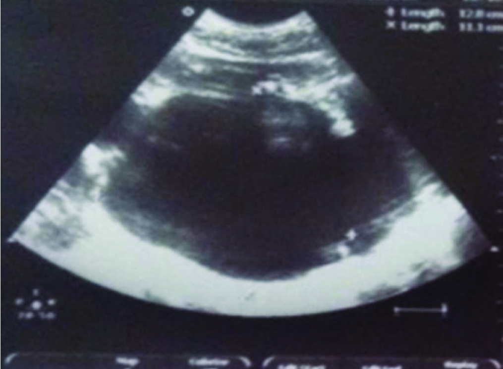 A 32-year-old male, presented with pain in abdomen, distension, breathlessness and anuria for three days. He was diagnosed elsewhere to have Acute Kidney Injury (AKI) and had undergone one session of Haemodialysis (HD) two days before presenting to our institute. He was pale with a pulse rate of 110/min, systolic blood pressure of 90 mm Hg and tachypnea (respiratory rate 30/minute). He had left sided abdominal fullness with a firm mass palpable in the left hypochondrium and lumbar regions. His blood urea 235 mg/ dl, serum creatinine was 8.2 mg/dl and haemoglobin was 6.5 g/dl. He was stabilised haemodynamically and HD was done. Ultrasound (US) showed an enlarged left kidney and a lower pole anechoic collection with septations, 11.4 x 9.9 x 8.6 cm [Table/Fig-1] and diagnostic aspirate was bloody. NCCT of kidneys showed left perinephric collection with compressed kidney [Table/Fig-2].