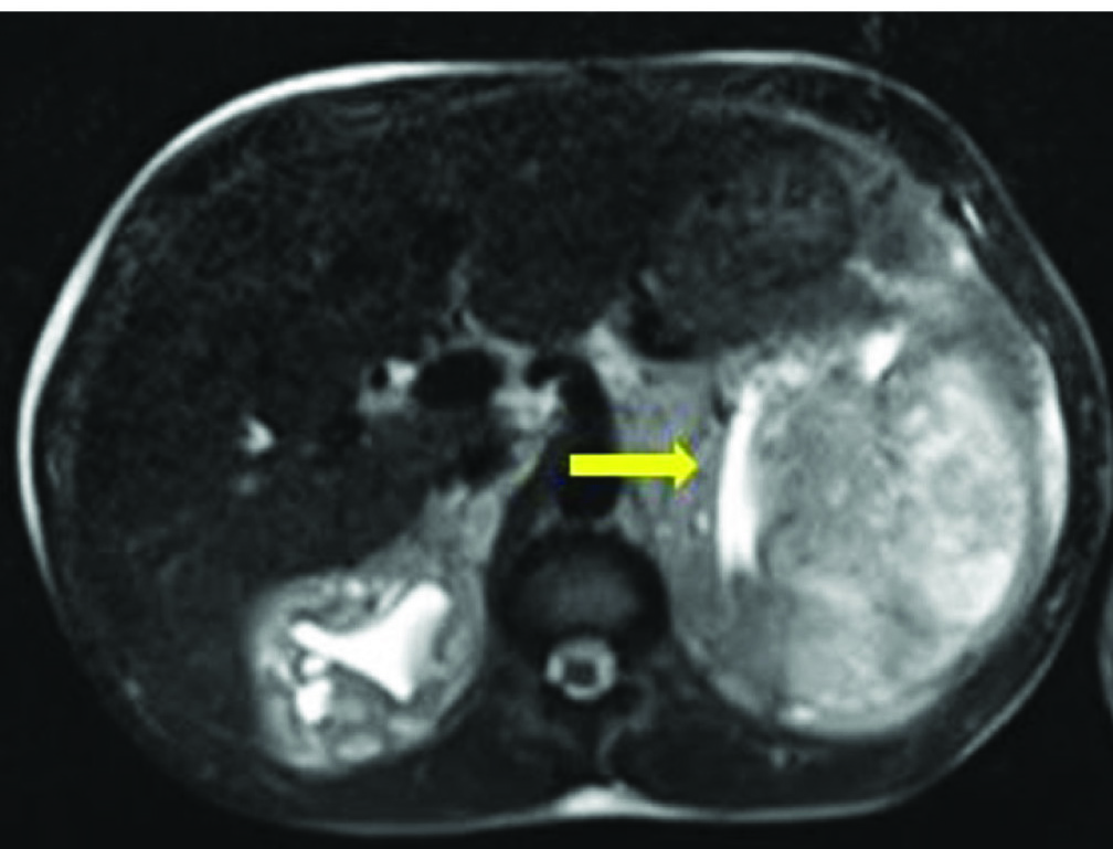 MRI suggestive of bilateral perirenal haematoma (arrow showing compressed left kidney).